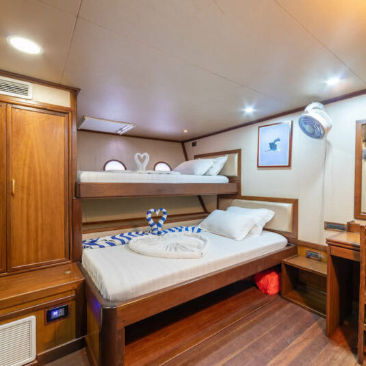 Featuring two bunk beds, this room can host up to 2 guests. Amenities include airconditioning, a closet, small vanity and a bathroom with shower